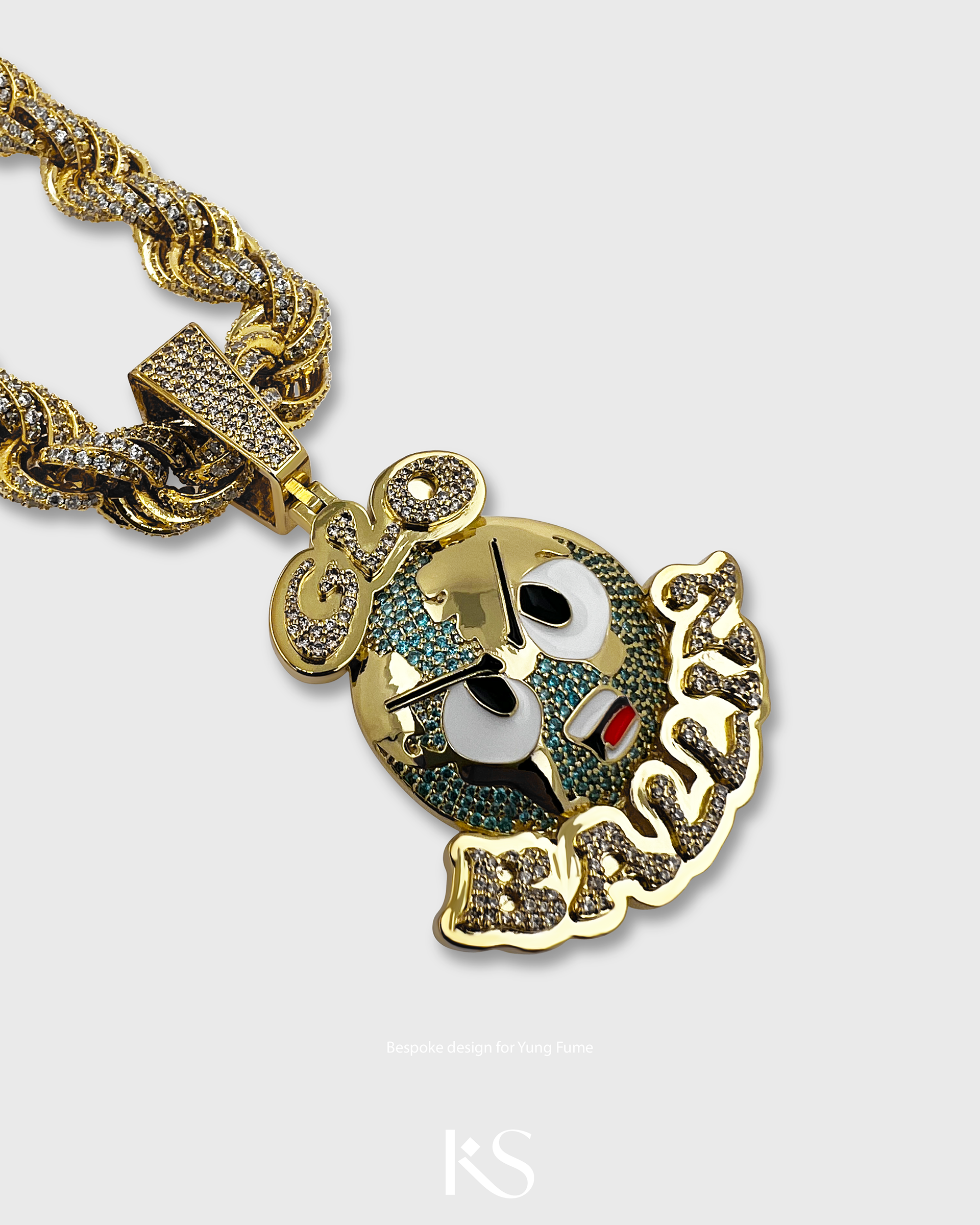 Custom pendant designed for Yung Fume with Aquamarine and Citrine stones combined with detailed enamel