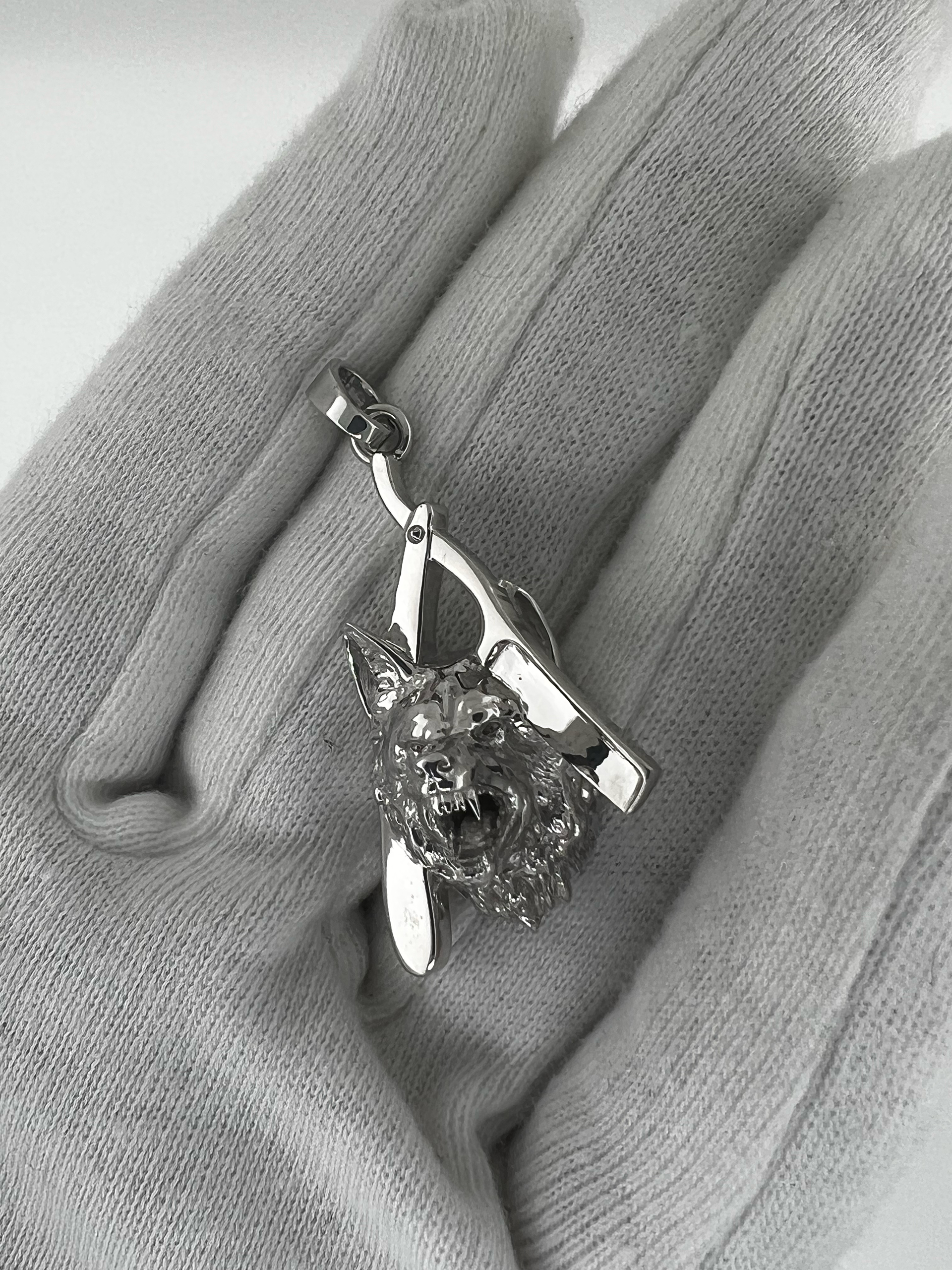 Solid 18K White Gold custom Wolf Pendant with a Razor Blade.